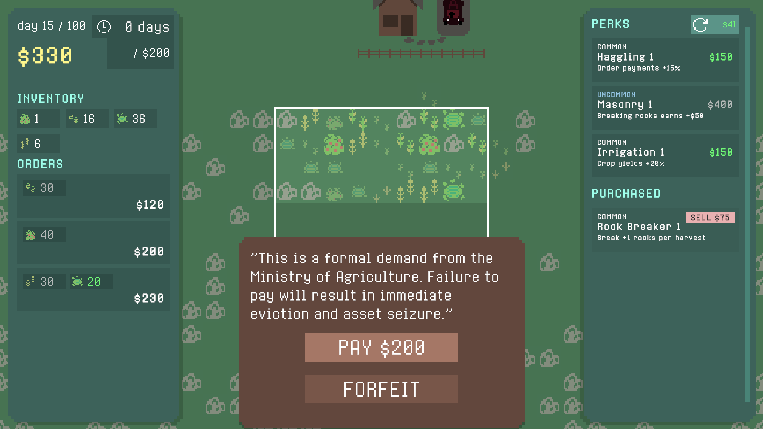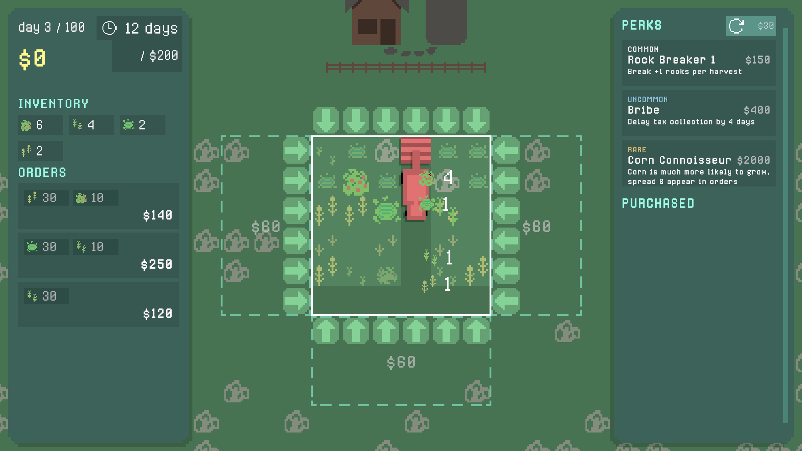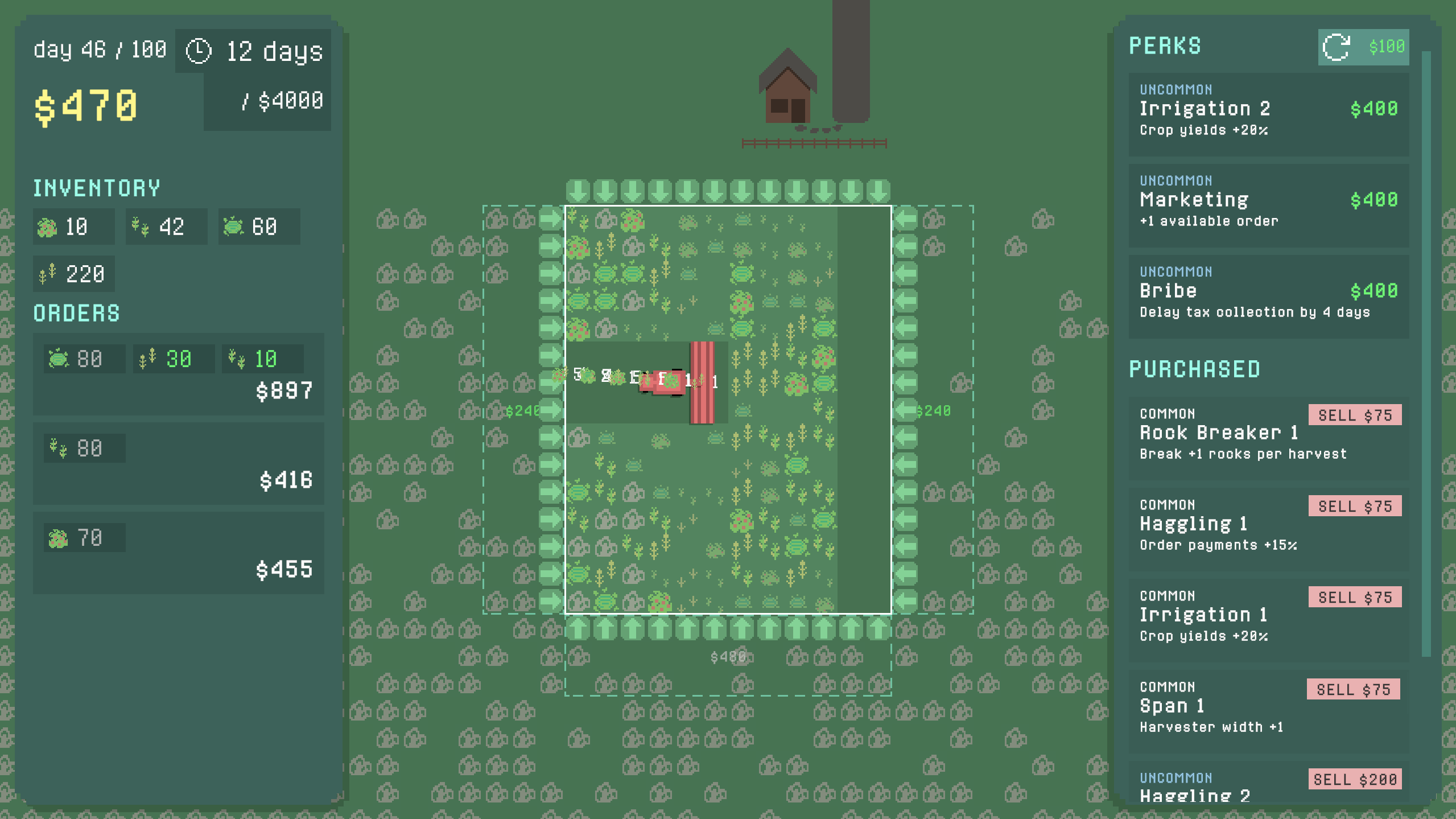 Cornscripted is a roguelite farming game. Run your combine harvester across the field to gather crops, fulfill orders to earn credits, purchase randomly drawn perks to upscale and specialize your production, and always be prepared to pay the Ministry collector who looms on the horizon.