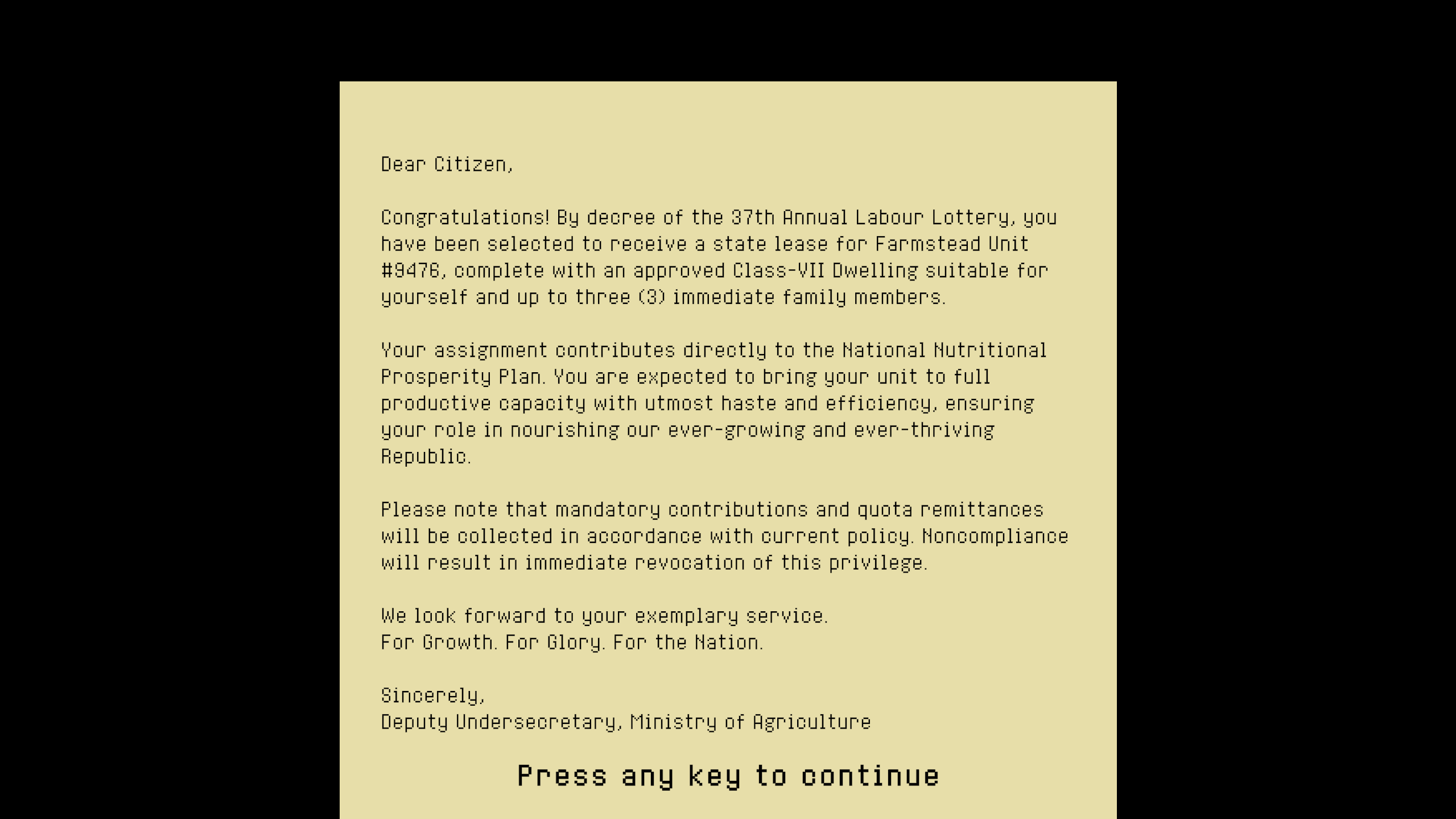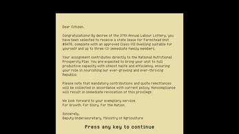 You’ve “won” the labour lottery. Now farm, expand, and appease the Ministry’s endless quotas—or lose everything. Survive 100 days to escape the regime.